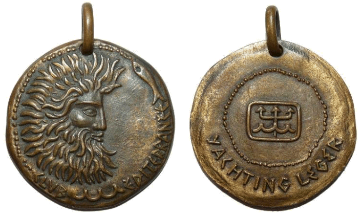 Vēsturiskā Club Méditerranée medaļa ar Neptūnu/Poseidonu un trīszari aizmugurē: